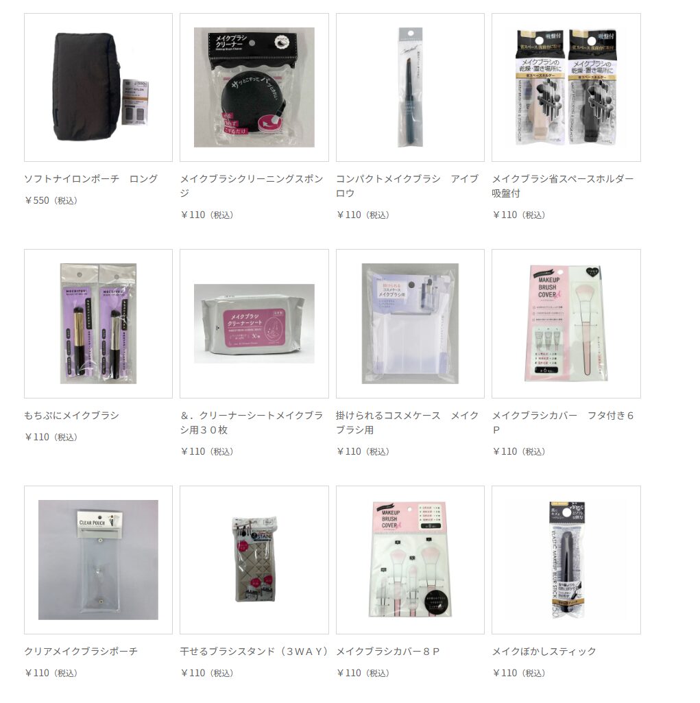 キャンドゥはスリム・実用重視で、「スリムブラシケース」(110円、ブラシ5〜10本)・「メッシュブラシポーチ」(110円、通気性良)・「折りたたみスタンドケース」(220円)充実。コンパクトでバッグ内整理に最適が特徴です。