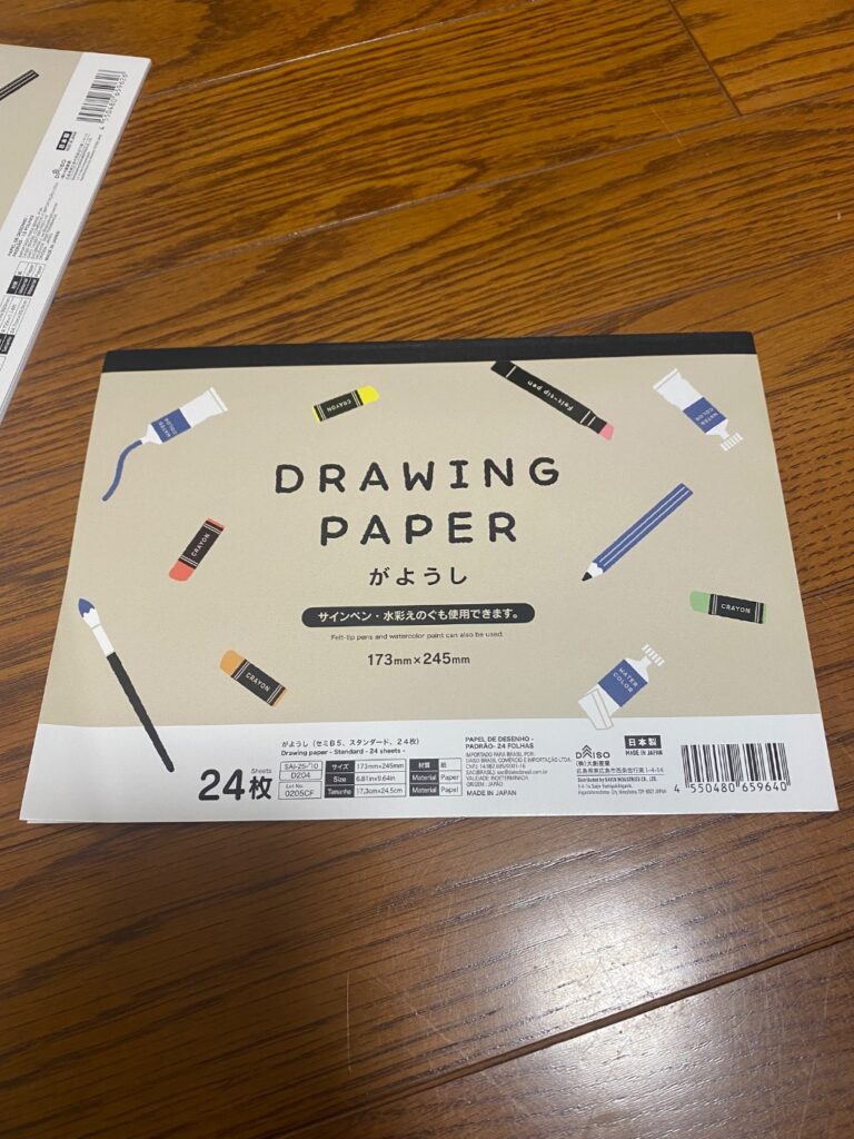 子供がお絵描きをしたいとのことで、ダイソーにて画用紙を購入しました。ダイソーには沢山の種類の画用紙があり、色つきのものもありますが、こちらは全て白色の画用紙です。