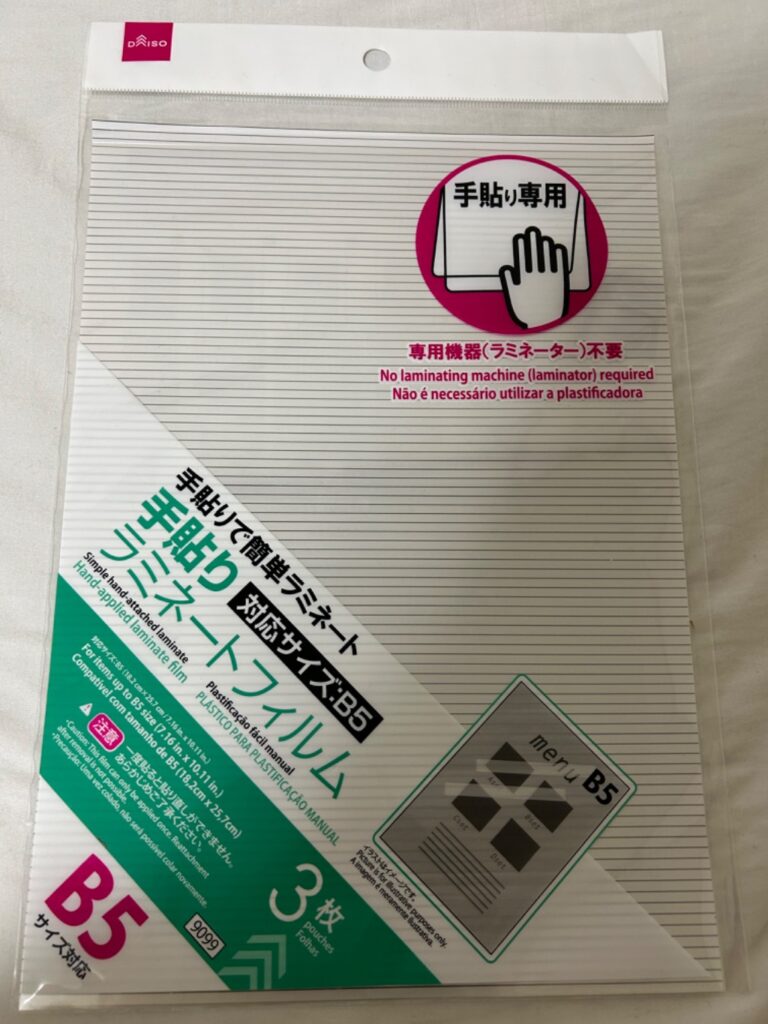 ダイソー 手貼りラミネートフィルム 機械なしで簡単にラミネートができる
