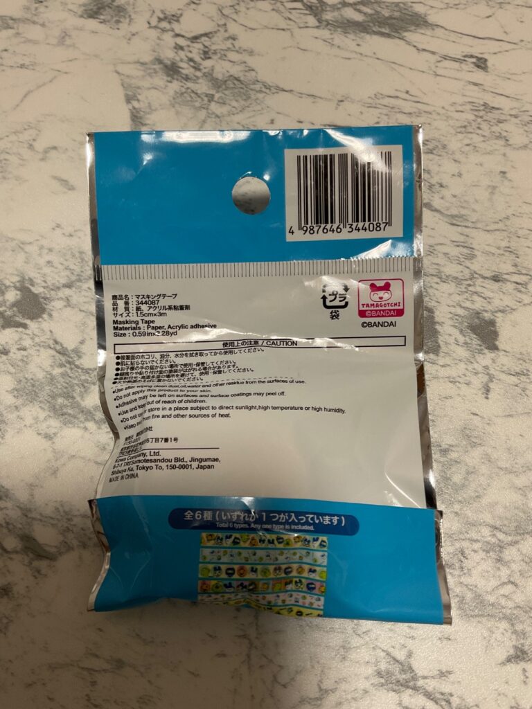 こんにちは、ヒャッコ君だよ!今回はダイソーで見つけた「たまごっち マスキングテープ」をご紹介するね。ダイソーとたまごっちのコラボ商品で、幅1.5cm、長さ3mの細いタイプのマスキングテープだよ。全6種のデザインがあって、どれが出るかは開けてからのお楽しみ。たまごっちファンにはたまらない可愛さだね!