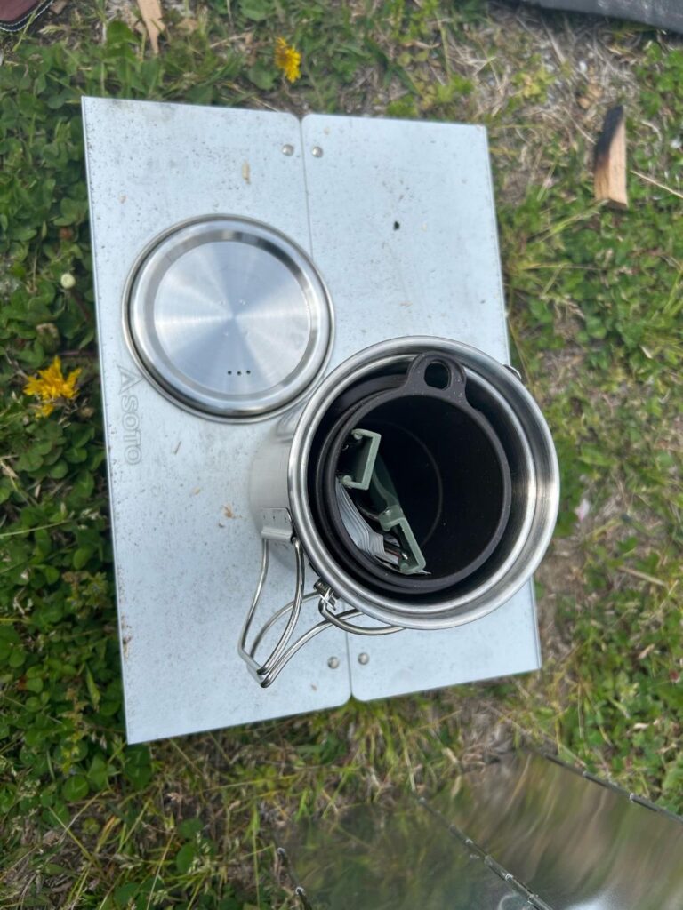 ステンレス製のため多少ラフに扱ってもへこまず安心。焚き火や直火周りに置いても気になりません。