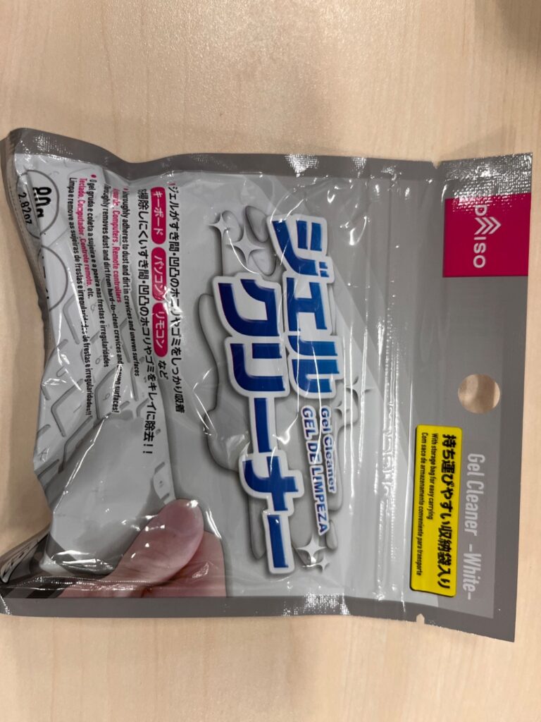 ダイソー大崎店で購入しました キーボードの隙間って、なんであんなにホコリ溜まるんだろう…と常々思っていた私。 そんなとき、ダイソーで見つけたのがこの「ジェルクリーナー」。お値段はもちろん税込110円! スライムみたいな見た目にちょっとドキドキしながら使ってみたんですが、これ、めちゃくちゃ使えるアイテムでした! パッケージから取り出すと、透明感のあるぷるぷるのジェル。 キーボードの上にポンと乗せて、軽く押しながらゆっくり持ち上げると… 細かいホコリやゴミがしっかりくっついてくる! これ、見ててちょっと気持ちいい(笑) しかも、ベタつきは最小限で、手につく感じもなくて快適。 キーボードだけじゃなく、リモコンのボタンの隙間や車のエアコン吹き出し口にも使えて万能! 注意点としては、押し込みすぎるとジェルがちぎれて残ることがあるので、あくまで優しく扱うのがコツ。 使い終わったら袋に戻して保管すれば、数回は繰り返し使えました。 掃除がちょっと楽しくなるし、なにより110円でこのクオリティは文句なし! 細かい場所のホコリに悩んでる人は、一度試してみる価値アリです!