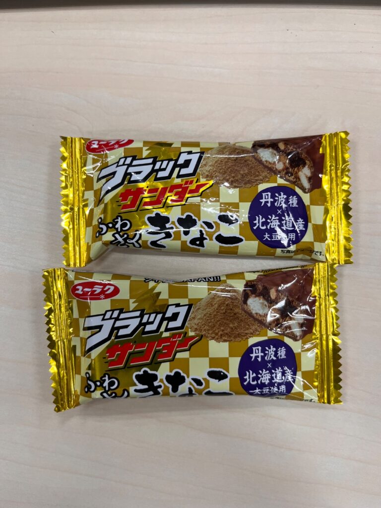 袋を開けた瞬間、ふわっと 香ばしいきなこの香り が漂ってきた。見た目はいつものブラックサンダーと似てるけど、ちょっと明るい色合いのチョコがコーティングされてる感じ。