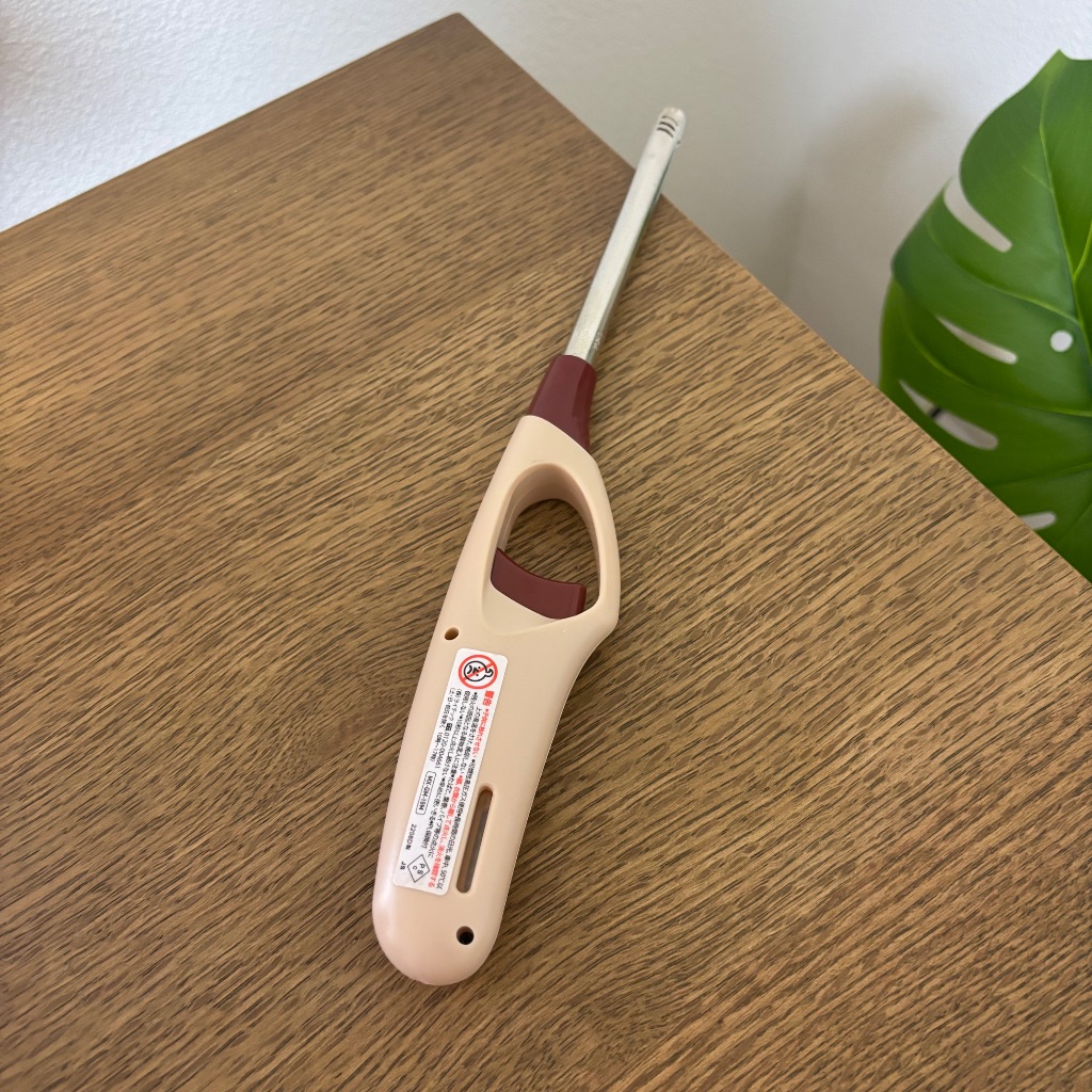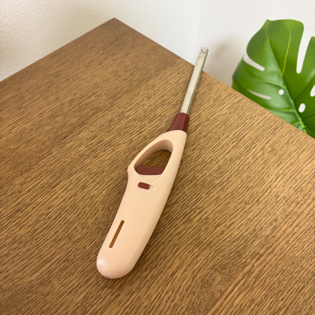 ダイソーで購入しました。ロング丈のライターです。とにかく配色がお気に入りで、肌色とこっくりボルドーの本体に、金属のシルバー。バランスが絶妙です♡ そのへんにポロッと置き忘れても様になります♡ 私は、キャンドルの炎をじーっと観る時に使っていましたが、料理やキャンプにもオススメ♡ 先端までが長いので、火傷もしにくく、安心して使えます。