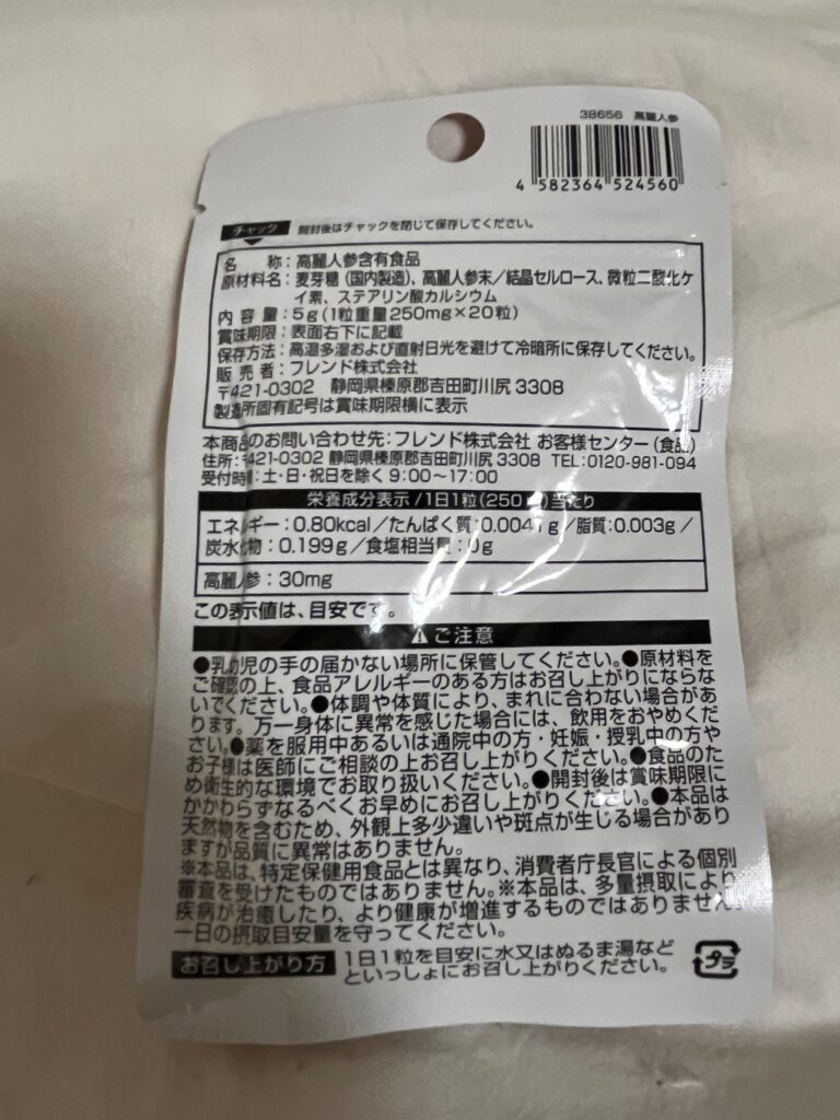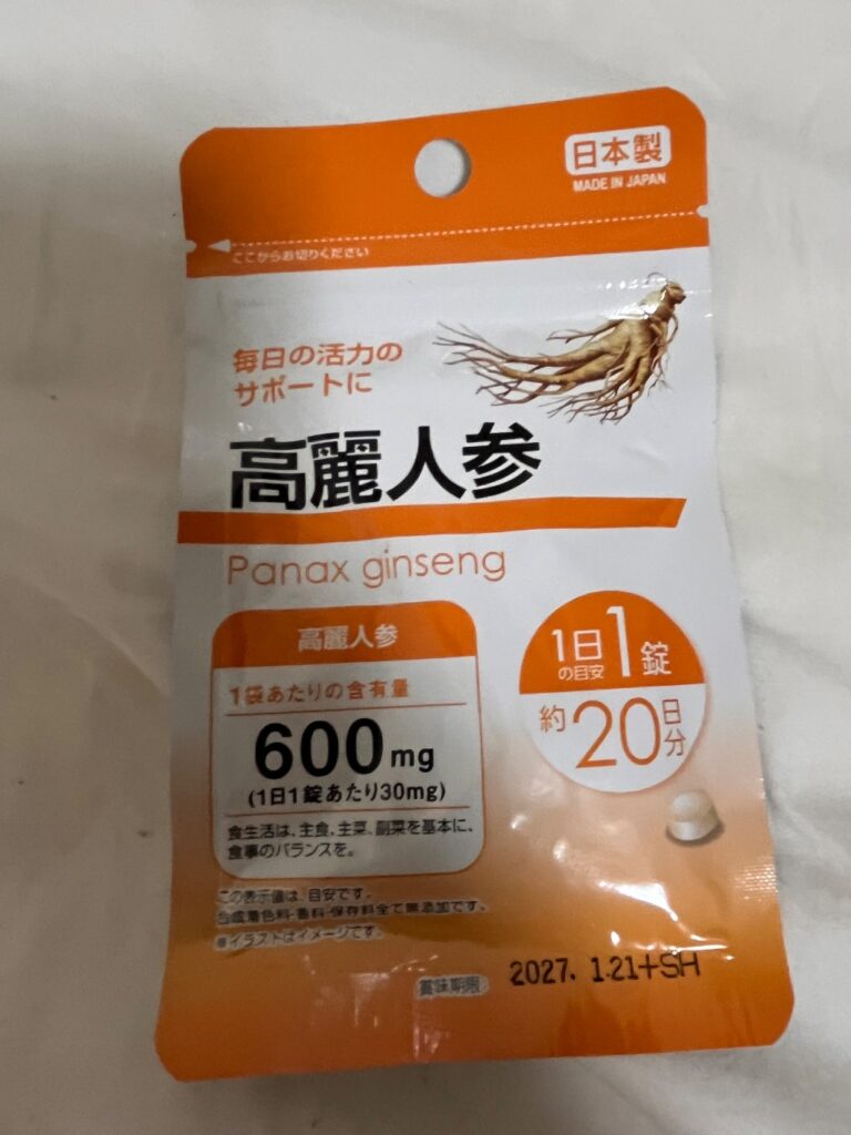 まず効能を調べてみました 以下の形でした ダイソーで販売されている高麗人参サプリメントは、一般的に高麗人参の根を原料としています。 高麗人参は、伝統的な漢方薬として広く利用されており、以下のような効能が期待されています。 • 免疫力の強化:高麗人参に含まれるサポニンは、免疫系を活性化し、感染症に対する抵抗力を高めるとされています。 • 疲労回復とスタミナ向上:エネルギーレベルを高め、疲労感を軽減する効果があるとされています。 • 認知機能の改善:記憶力や集中力を向上させる可能性が示唆されています。 • 血糖値の調整:血糖値を安定させる作用があるとされています。 最近疲れが取れないので一度使ってみて判断してみるつもりです。 昨日から使っていますが1日目は気持ち体が楽かもしれません。 もっと使って効果が感じられれば記載しますw
