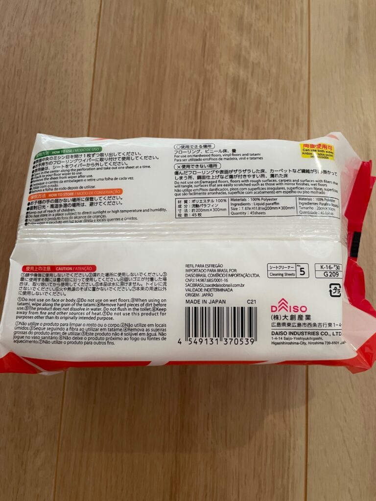 ダイソーで購入しました。落ち落ちくんのフローリングドライシートで毎晩床掃除の際に使用しています。