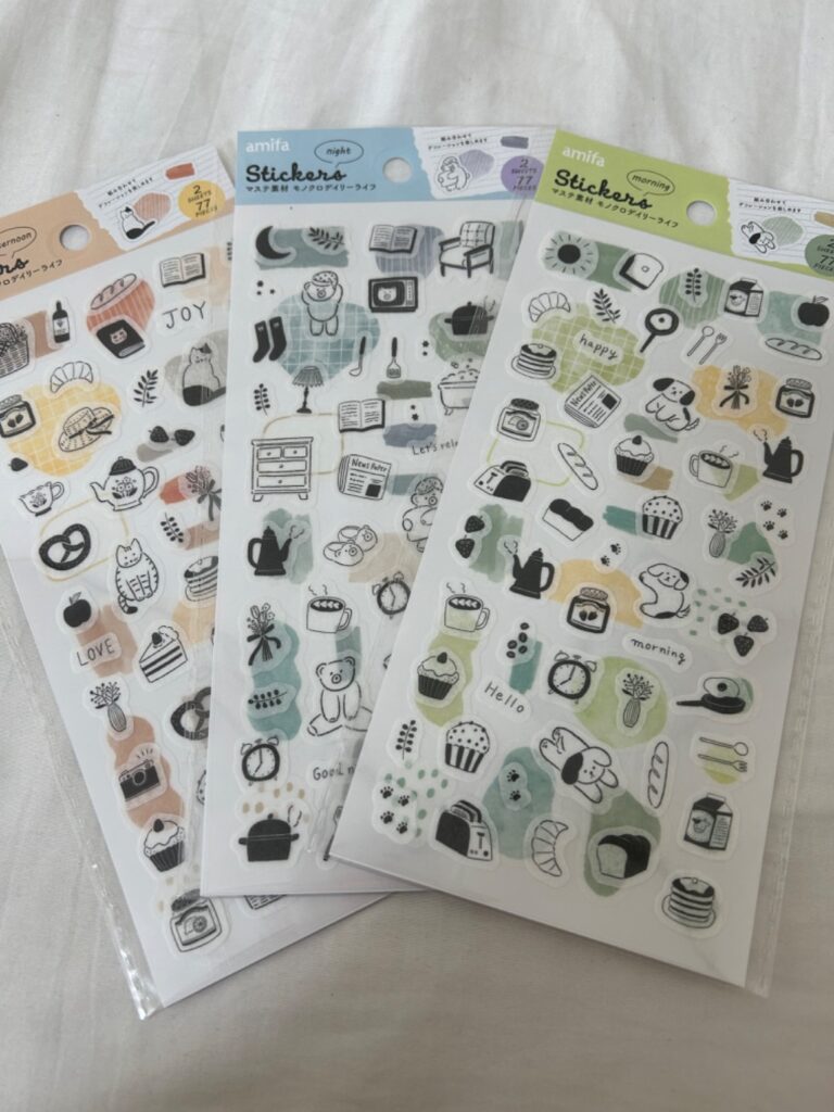パステルカラーの色味が最高に可愛いし、モノクロの手書き感のある絵も手帳に使いやすくていいです。