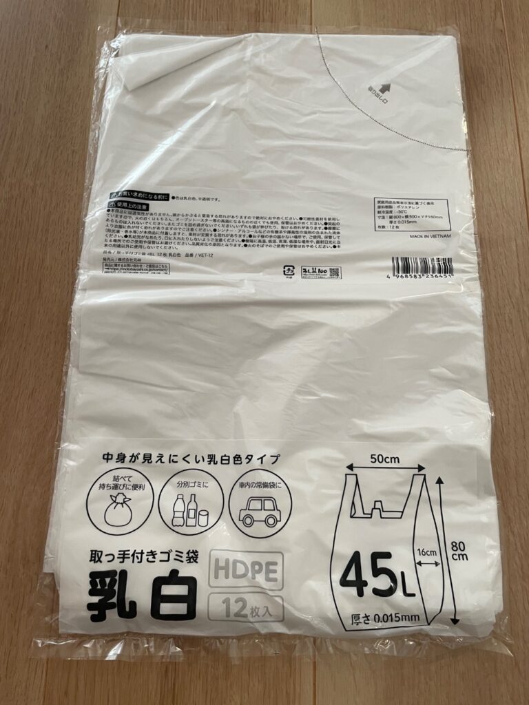 セリアで購入しました。家庭用のごみ袋・45Lの商品です。この商品についてはもう長年使用しており、乳白色のため中の透け防止にもなり、ごみ袋には珍しいスーパーの袋のような形なので、持ち手があってかなり便利です。