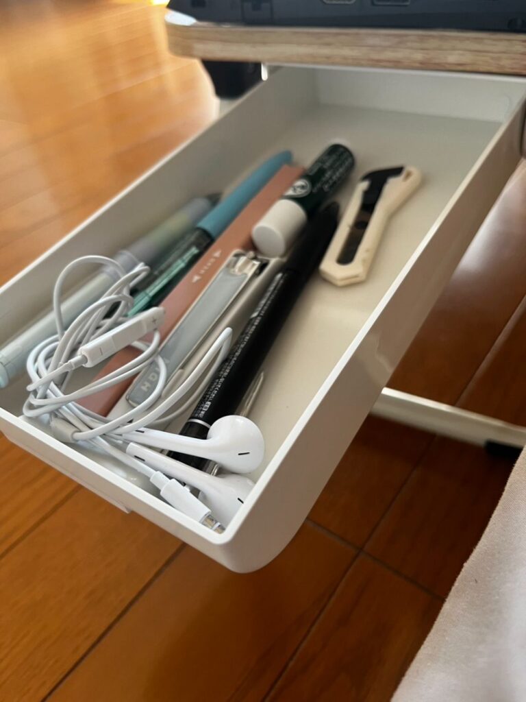 PC作業をするデスクに小物を入れて置ける引き出しが欲しく、取り付け式の本商品を購入。粘着部分で机に張り付けて使用が出来る良かった点