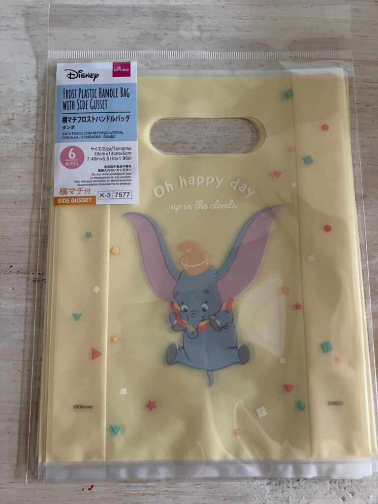 お菓子の小分けに購入。イベントなどばら撒きの時にいいのでいつも購入しています。可愛いデザインも多く、ディズニーはとっても豊富で迷ってしまう程でした!ちょっとしたお菓子をあげる時に可愛い袋だとテンション上がるし、もらった側も嬉しいのではないかなぁと思います!ダンボはなかなか見なかったので購入してよかったです!
