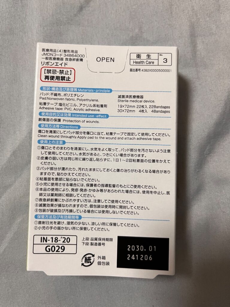 私がダイソーで購入した防水ばんそうこうは、100均で手頃な価格ながらも、しっかりとした品質を実感できるアイテムです。水に濡れても剥がれにくく、断水や雨天の非常時でも傷口をしっかりと保護してくれるため、災害時の応急処置に大変役立ちます。