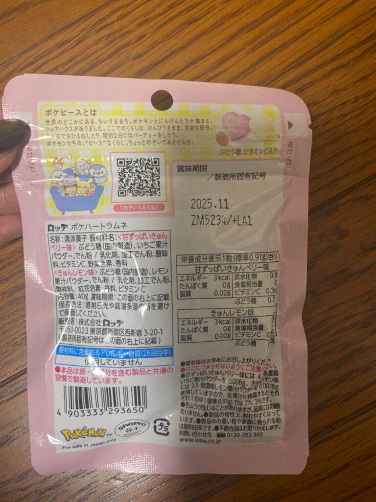 キャンドゥにて購入しました。 ポケモンのラムネです。 ハートの形のラムネにポケモンの柄が入っていてベリー味のものと、丸い形でレモン味のものが入っています。どちらもしっかりした味で美味しかったです。 本当に沢山入っているのでなかなか無くなりません。 しかもポケモンの柄が可愛い!全部で7種類あります。絵柄を見て楽しみながら頂けて子供も喜びます。
