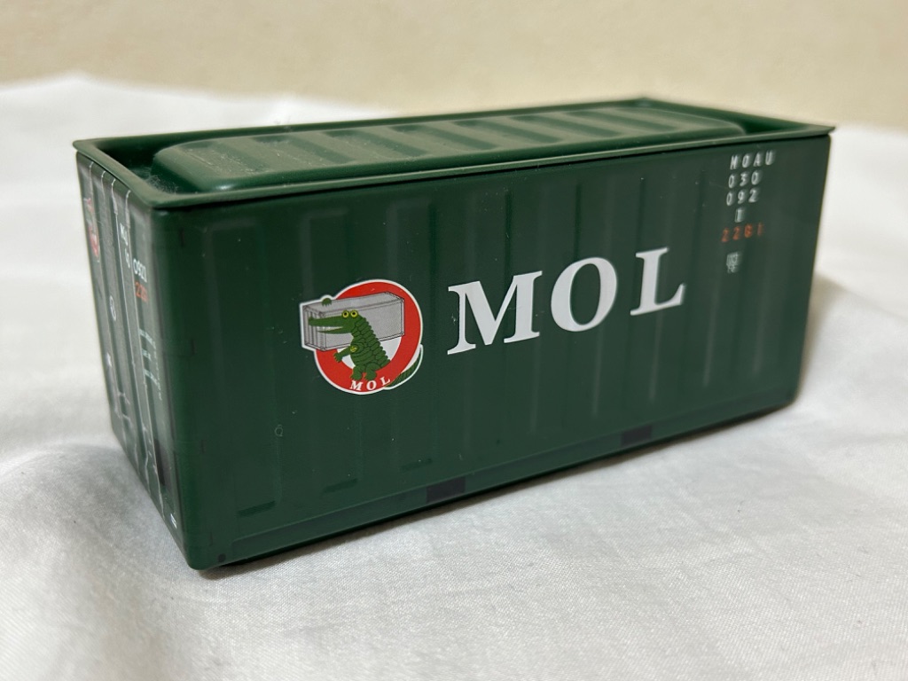 海運のコンテナのミニチュアです。スチール素材でしっかりしています。蓋が開くので中にマステとか修正テープなど、よく使う小物を入れて使っています。深い緑色とワニ... -